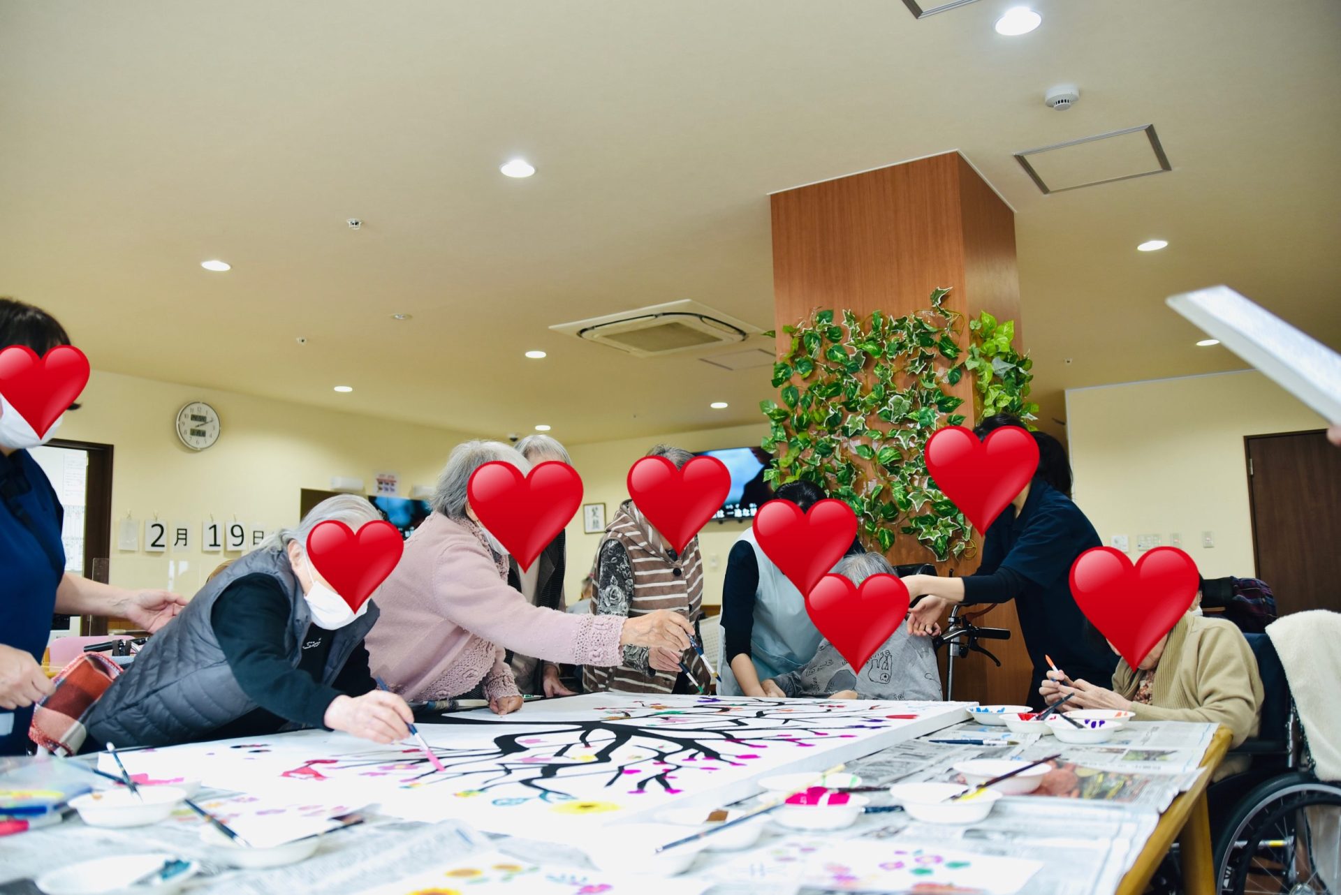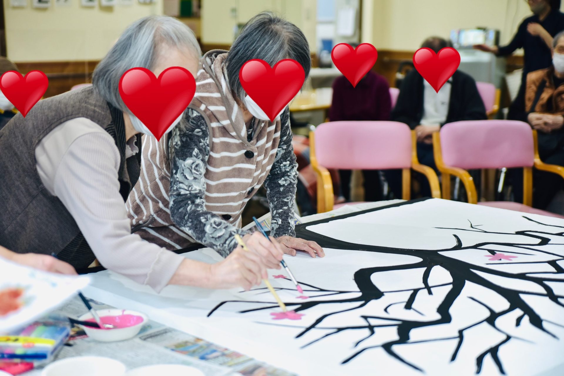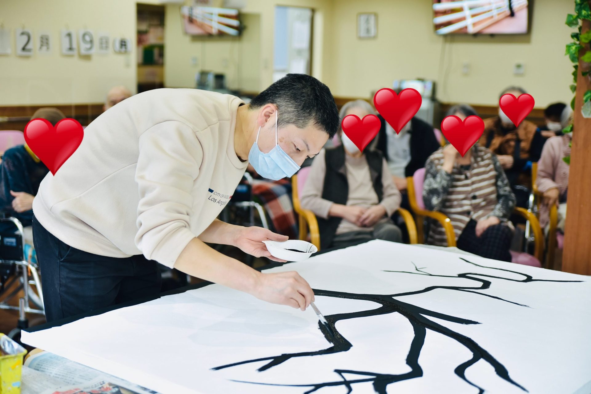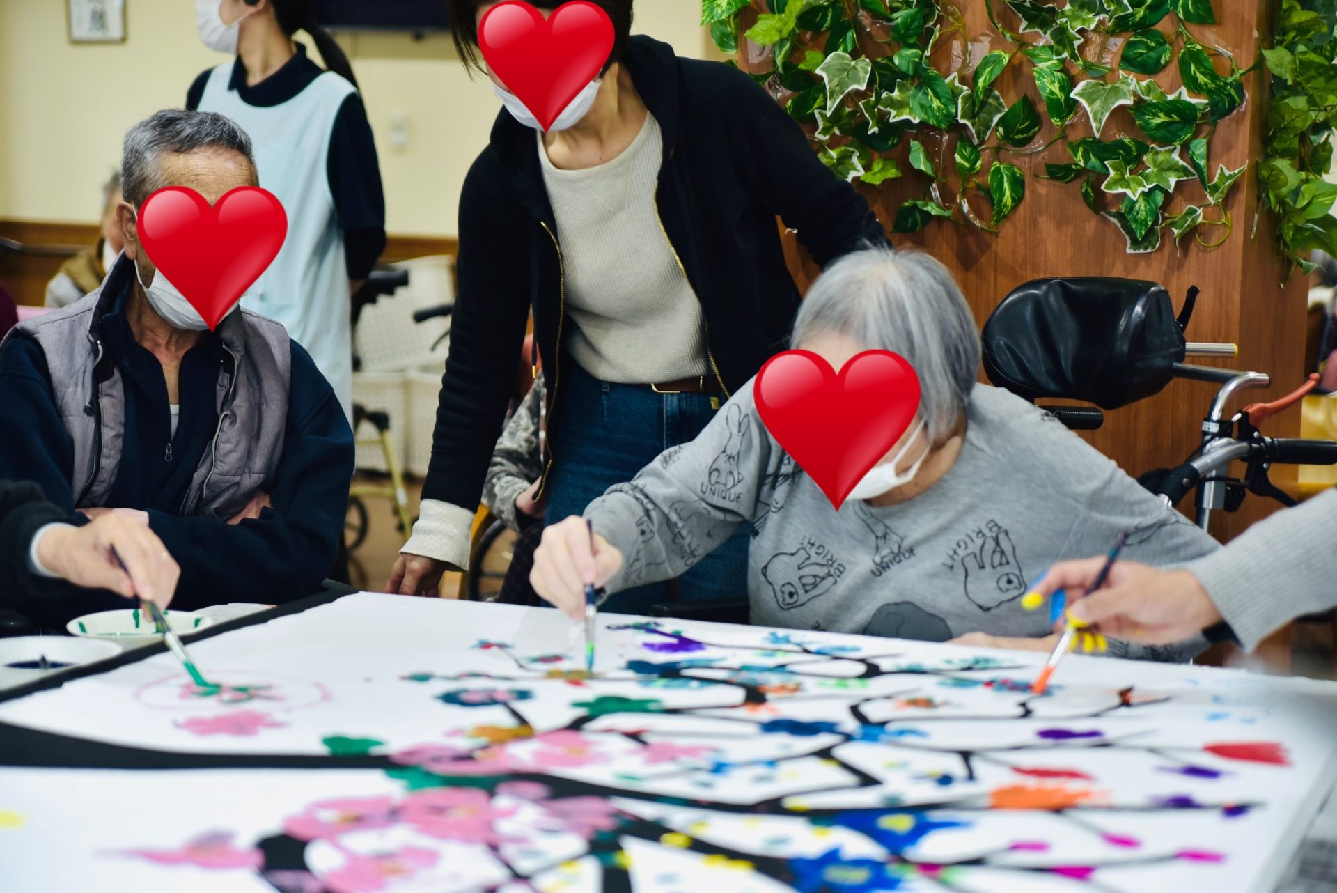 また、老人ホームなどの施設やお子様の団体や集まりに出張し、1枚の大きなキャンバスにみんなで絵を書いたりするようなワークショップも大人気です。